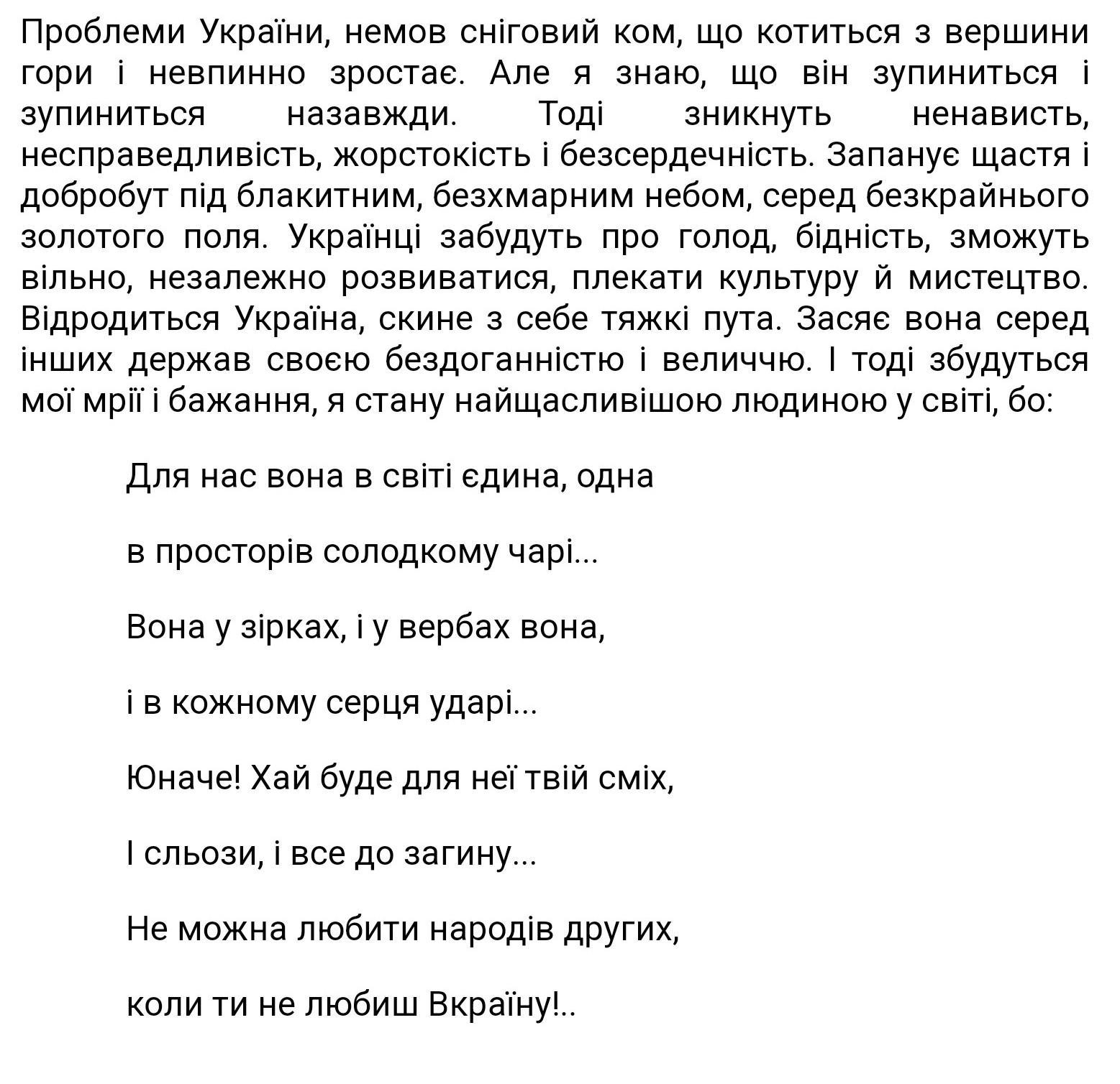 Написати контрольне есе на тему (мої мрії про Україну) в есе жити 3-4 речення з прямою мовою обсяг роботи одна сторінка, пожалуйста Помогите у меня контрольная работа! Пишите от моего лица пожалуйста!