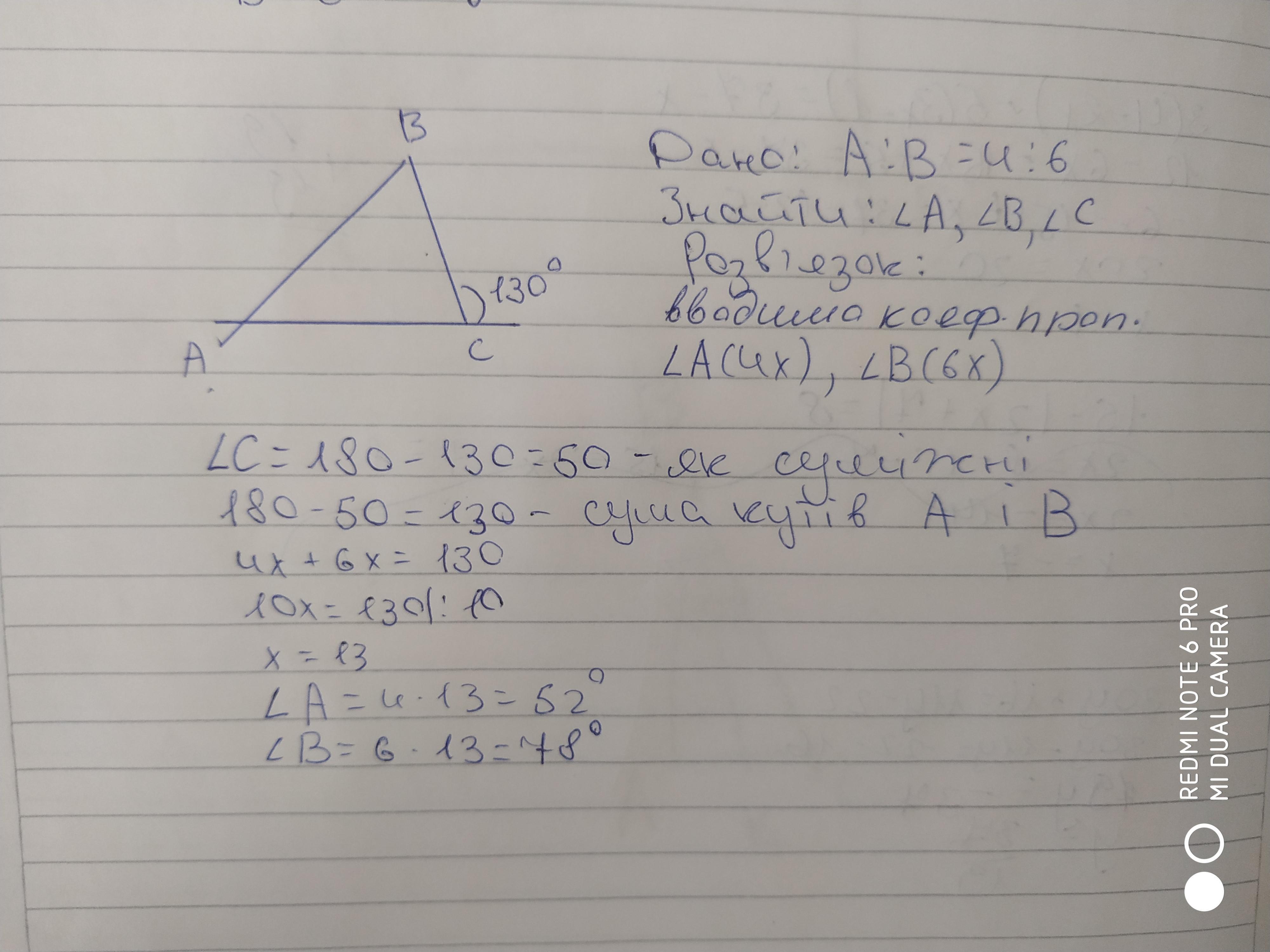 Два внутрішні кути трикутника відносяться як 4 : 6, а зовнішній кут при іншій вершині дорівнює 130°. Знайдіть невідомі кути трикутника.