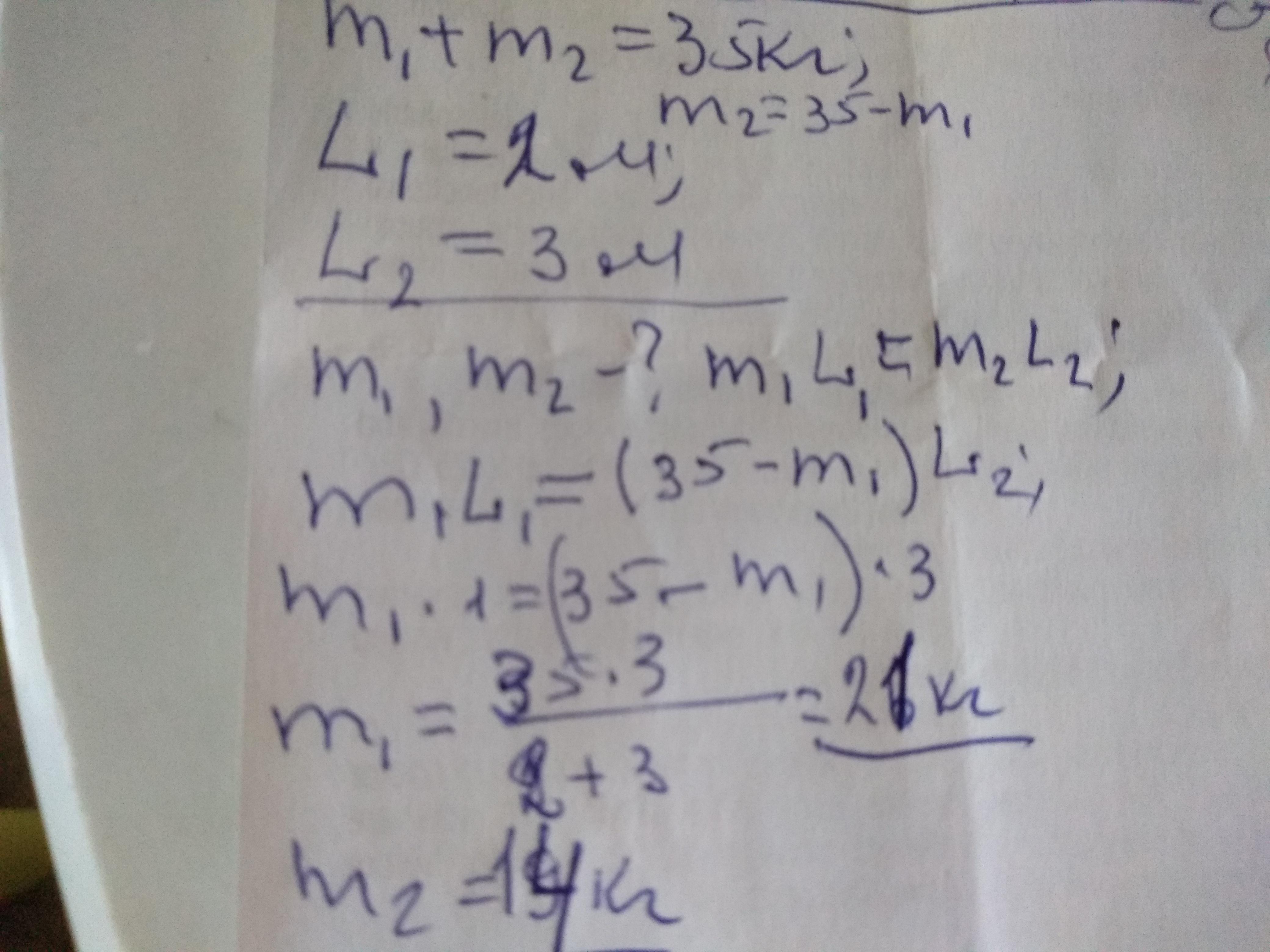 Загальна масса двох вантажів дорівнює 35кг.Якою є маса кожного вантажу,якщо важіль перебуває в рівновазі? Даю 25 баловв
