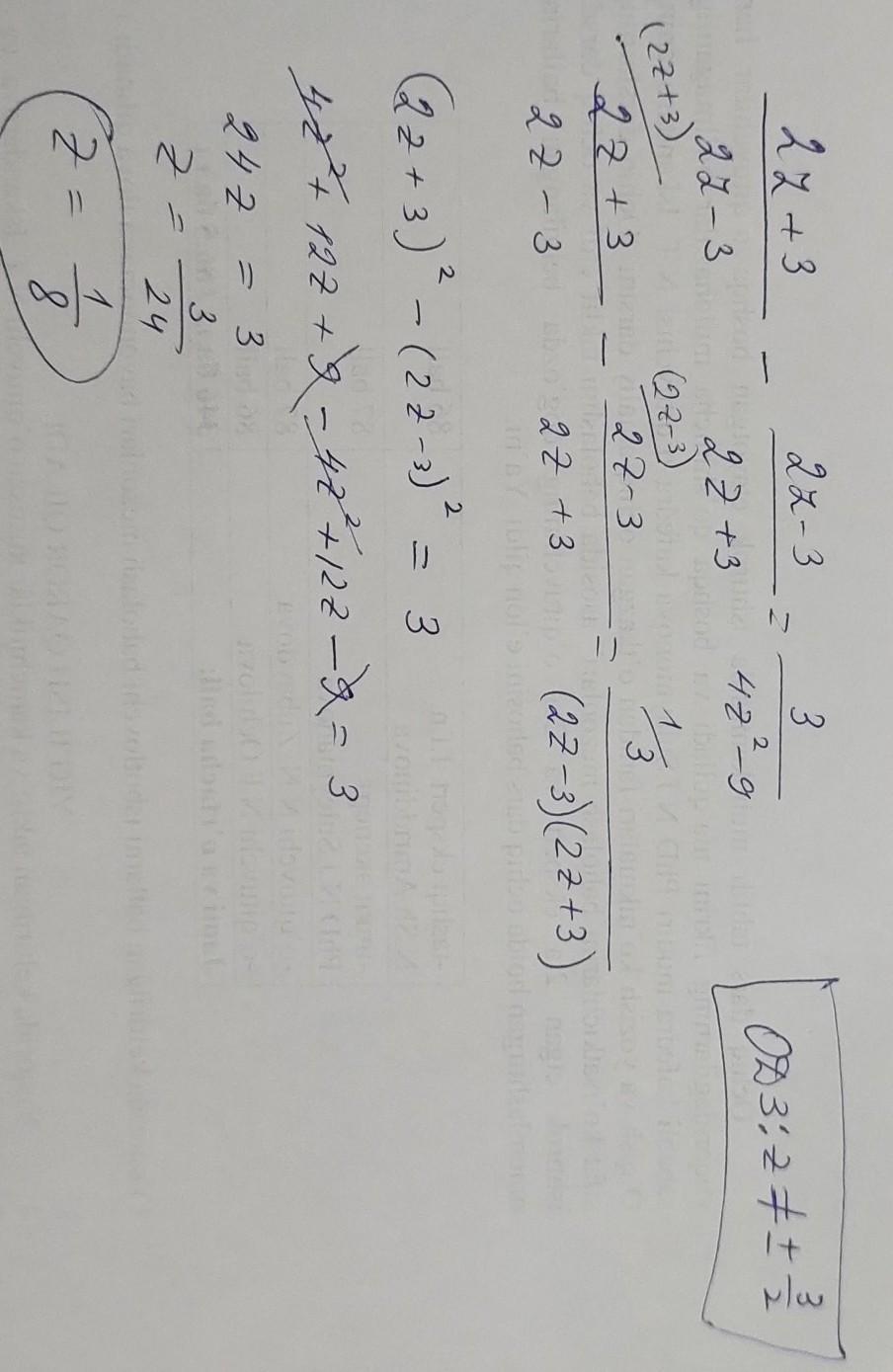 (2z + 3)/(2z - 3) - (2z - 3)/(2z + 3) = 3/(4z² - 9)