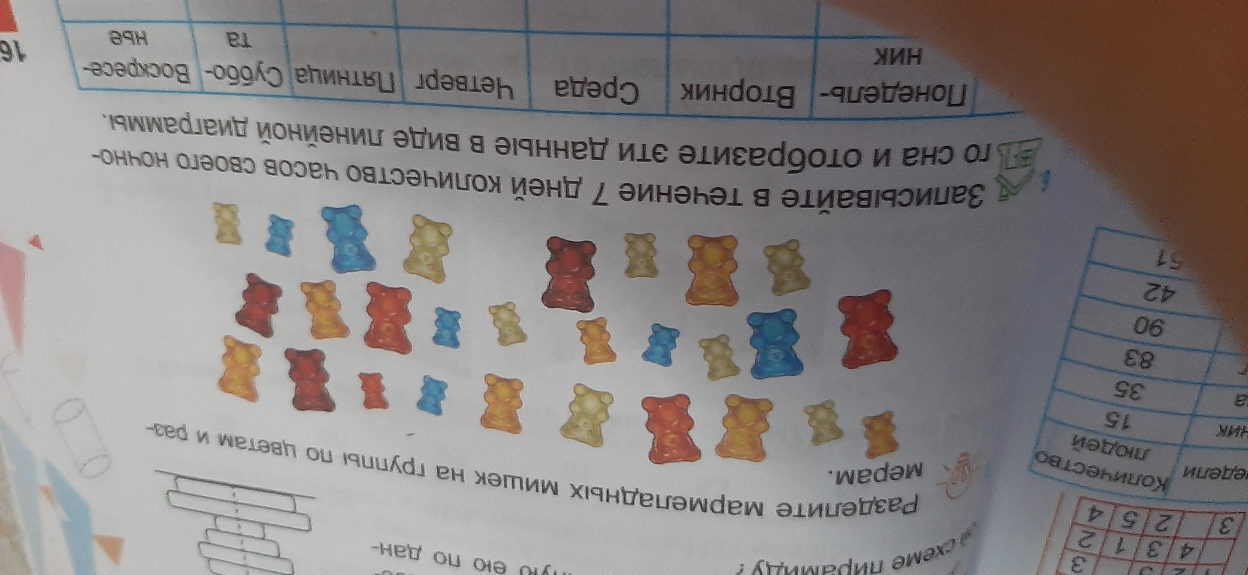 Разделите мармеладных мишек на группы по цветам и размерам. (Который по середине)