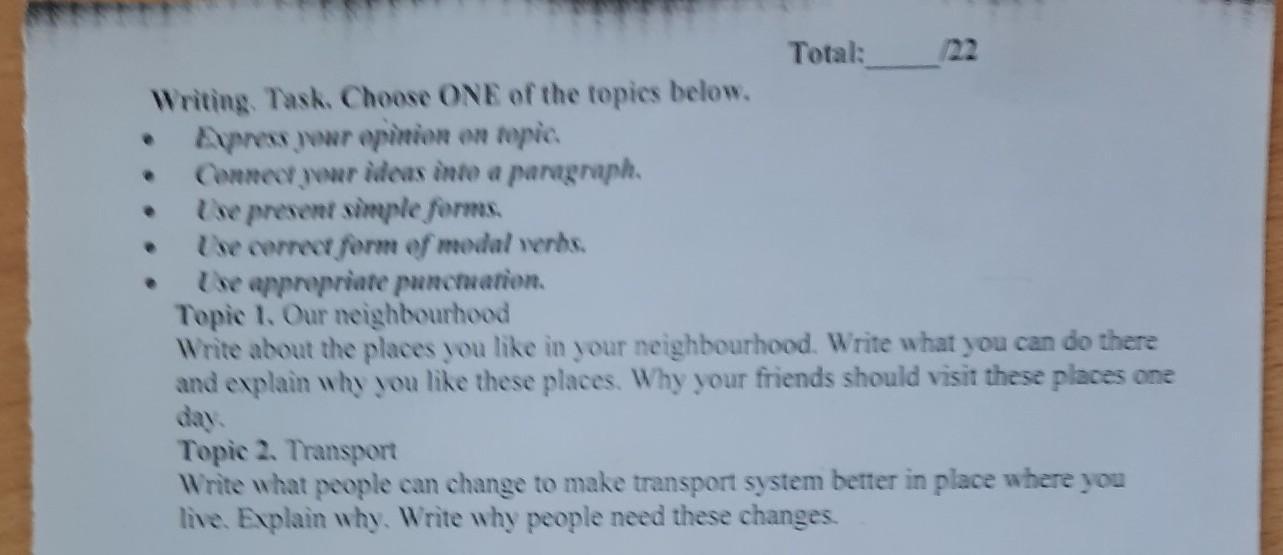 Writing Task. Choose ONE of the topics below. Express your opinion on topic. Connect your ideas into a paragraph. Use present simple forms. Use correct form of modal verbs. Use appropriate punctuation. Topic 1. Our neighbourhood Write about the places you like in your neighbourhood. Write what you can do there and explain why you like these places. Why your friends should visit these places one day. e Total:_________/22 · Topic 2. Transport Write what people can change to make transport system better in place where you live. Explain why. Write why people need these changes.