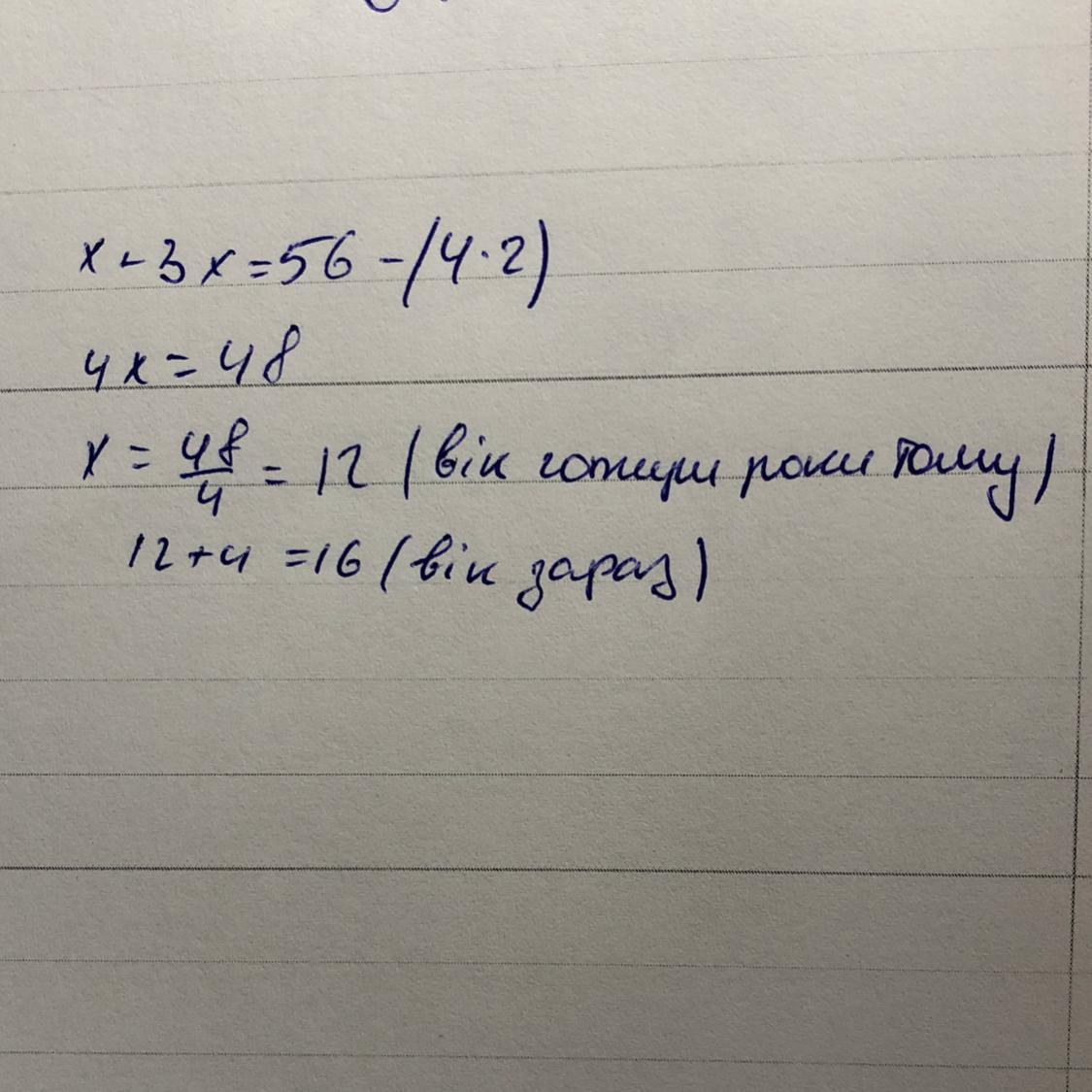 Сума віку Андрія та Каті дорівнює 56 років. Чотири роки тому Андрiй був утричі старший за Катю. Скільки років Андрію зараз?