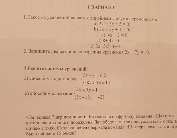 1 ВАРИАНТ 1.Какое из уравнений является линейным с двумя переменными a) 2x2+3x + 5 = 0; b) 3x + 2y + 1 = 0; c) 4x + 3 = 0 d) 8+ 4x=0 e) 3x+5x2+1=0 2. Запишите два различных решения уравнения 2х + 7y = 10. 3.Решите системы уравнений: а) способом подстановки b) способом сложения 5x-y= 6,2 0,8x+3y=13 [4x +9y=1 5x-18y=-28