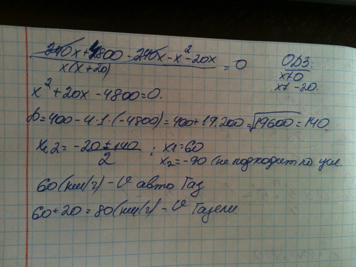 1)Задача: Из пункта А в пункт В, находящийся на расстоянии 240 км от пункта А, одновременно выехали два автомобиля: Газель и ГАЗ .Скорость Газели на 20 км/ч больше скорости ГАЗа. Газель прибыла в пункт В на 1 час раньше. Найти скорость каждого автомобиля. Я уже решила,что х-скорость ГАЗа и 20 + х - скорость Газели.