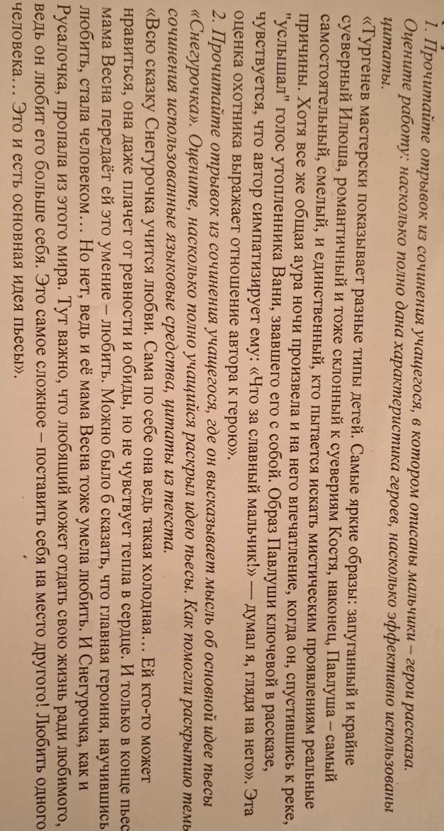 8. Задание. Дайте письменный развернутый ответ на один из вопросов на ваш выбор. Объем работы - 100-120 слов. [10] 1. Прочитайте отрывок из сочинения учащегося, в котором описаны мальчики – герои рассказа. Оцените работу: насколько полно дана характеристика героев, насколько эффективно использованы цитаты. «Тургенев мастерски показывает разные типы детей. Самые яркие образы: запуганный и крайне суеверный Илюша, романтичный и тоже склонный к суевериям Костя, наконец, Павлуша - самый самостоятельный, смелый, и единственный, кто пытается искать мистическим проявлениям реальные причины. Хотя все же общая аура ночи произвела и на него впечатление, когда он, спустившись к реке, "услышал" голос утопленника Вани, звавшего его с собой. Образ Павлуши ключевой в рассказе, чувствуется, что автор симпатизирует ему: «Что за славный мальчик!» оценка охотника выражает отношение автора к герою». - думал я, глядя на него». Эта 2. Прочитайте отрывок из сочинения учащегося, где он высказывает мысль об основной идее пьесы «Снегурочка». Оцените, насколько полно учащийся раскрыл идею пьесы. Как помогли раскрытию темы сочинения использованные языковые средства, цитаты из текста. «Всю сказку Снегурочка учится любви. Сама по себе она ведь такая холодная... Ей кто-то может нравиться, она даже плачет от ревности и обиды, но не чувствует тепла в сердце. И только в конце пьесы мама Весна передаёт ей это умение - любить. Можно было б сказать, что главная героиня, научившись любить, стала человеком... Но нет, ведь и её мама Весна тоже умела любить. И Снегурочка, как и Русалочка, пропала из этого мира. Тут важно, что любящий может отдать свою жизнь ради любимого, ведь он любит его больше себя. Это самое сложное - поставить себя на место другого! Любить одного человека... Это и есть основная идея пьесы».
