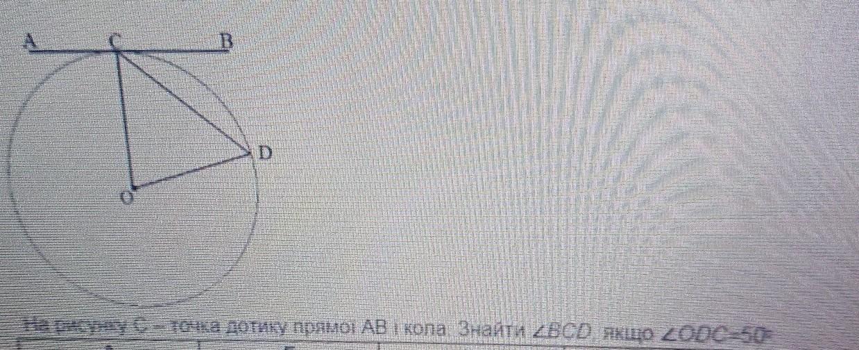 В D На рисунку С - точка дотику прямої АВ і копа. Знайти кут ВСD, якщо кут ODC=50