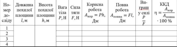 Сформулюйте висновок, у якому: 1) Для кожного досліду порівняйте значення сили (F) зі значенням ваги тіла (P) і зробіть висновок про виграш у силі, який дає похила площина. 2) Порівняйте корисну та повну роботу. 3) Порівняйте одержані значення ККД і зробіть висновок, чи залежить ККД від ваги тіла, яке піднімають похилою площиною.