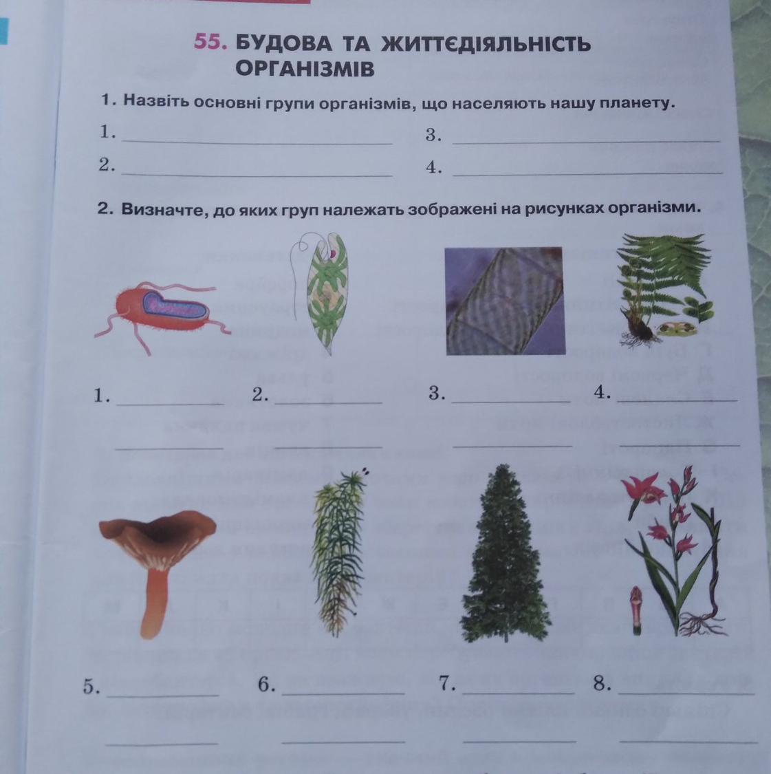 1 бактерия 2 простейшее 3 водоросли 4 папоротник 5 гриб 6 мох 7 голосеменное 8 цветок