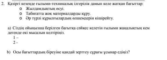 2. Казiргi кезенде ғылыми-техникалык iлгерiлiк дамып келе жаткан бағыттар: о Жылдамдыктын есуі. o Табиғатта жок материалдарды куру. о Әр түрлі құрылғылардың елшемдерiн кiшiрейту. а) Сiздiн ойынызша берілген бағытка сәйкес келетiн ғылыми жаналыктын кем дегенде екi мысалын келтiрiнiз. 1- 2- b) Осы бағыттардын бiреуiне кандай зерттеу сұрағы ұсынар едіңіз?