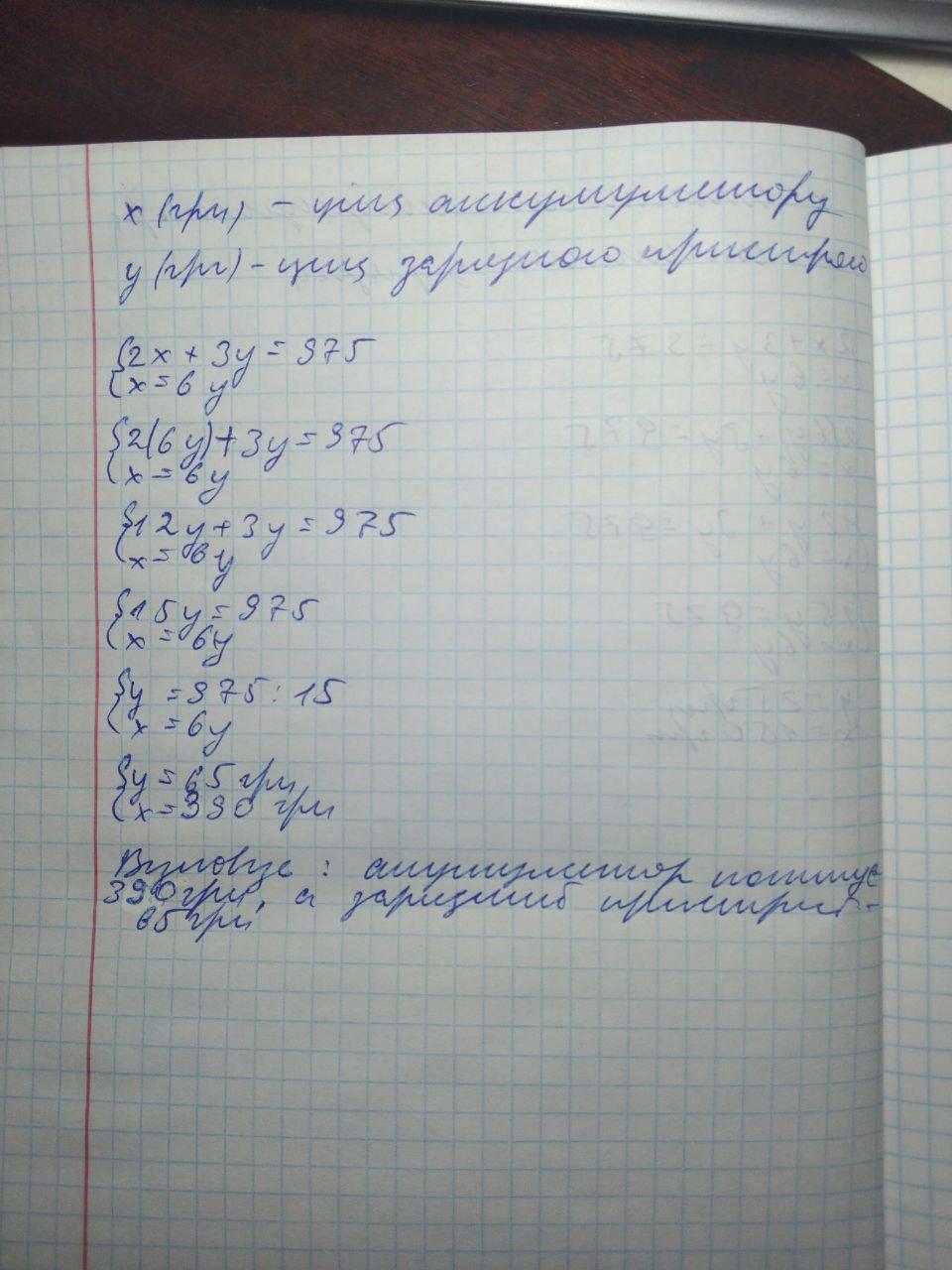 За два акумулятори і три пристрої для зарядки заплатили 975 грн. Скільки коштує акумулятор і скільки коштує зарядний пристрій, якщо акумулятор коштує стільки ж, скільки 6 зарядних пристроїв.