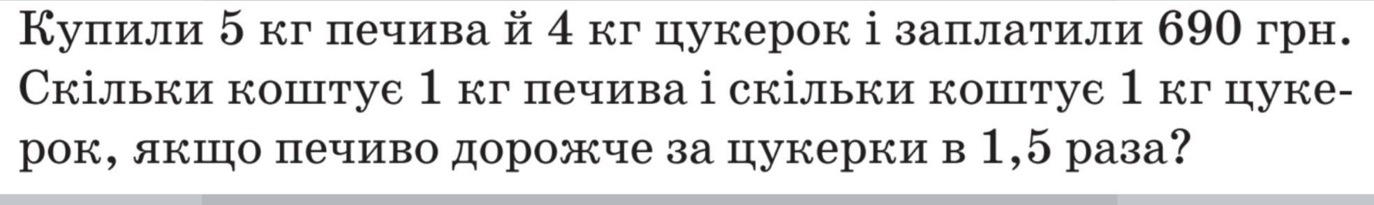 Купили 5 кг печива й 4 кг цукерок і заплатили 690 грн. Скільки коштує 1 кг печива і скільки коштує 1 кг цукерок, якщо печиво дорожче за цукерки в 1,5 раза?