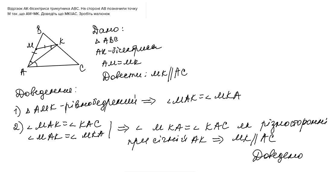 Відрізок АК-бісектриса трикутника АВС. На стороні АВ позначили точку М так ,що АМ=МК. Доведіть що МК||АС. Зробіть малюнок