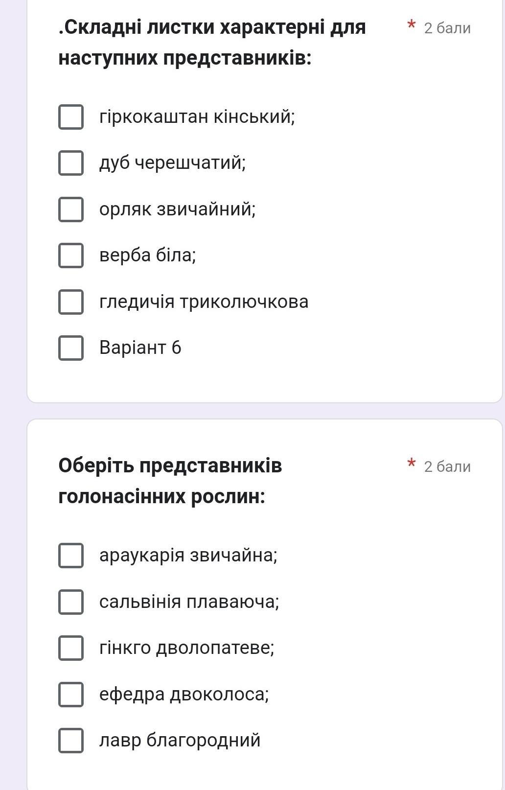 Варіант 6: Представниками голонасінних рослин є араукарія звичайна, гінкго дволопатеве та ефедра двоколоса.