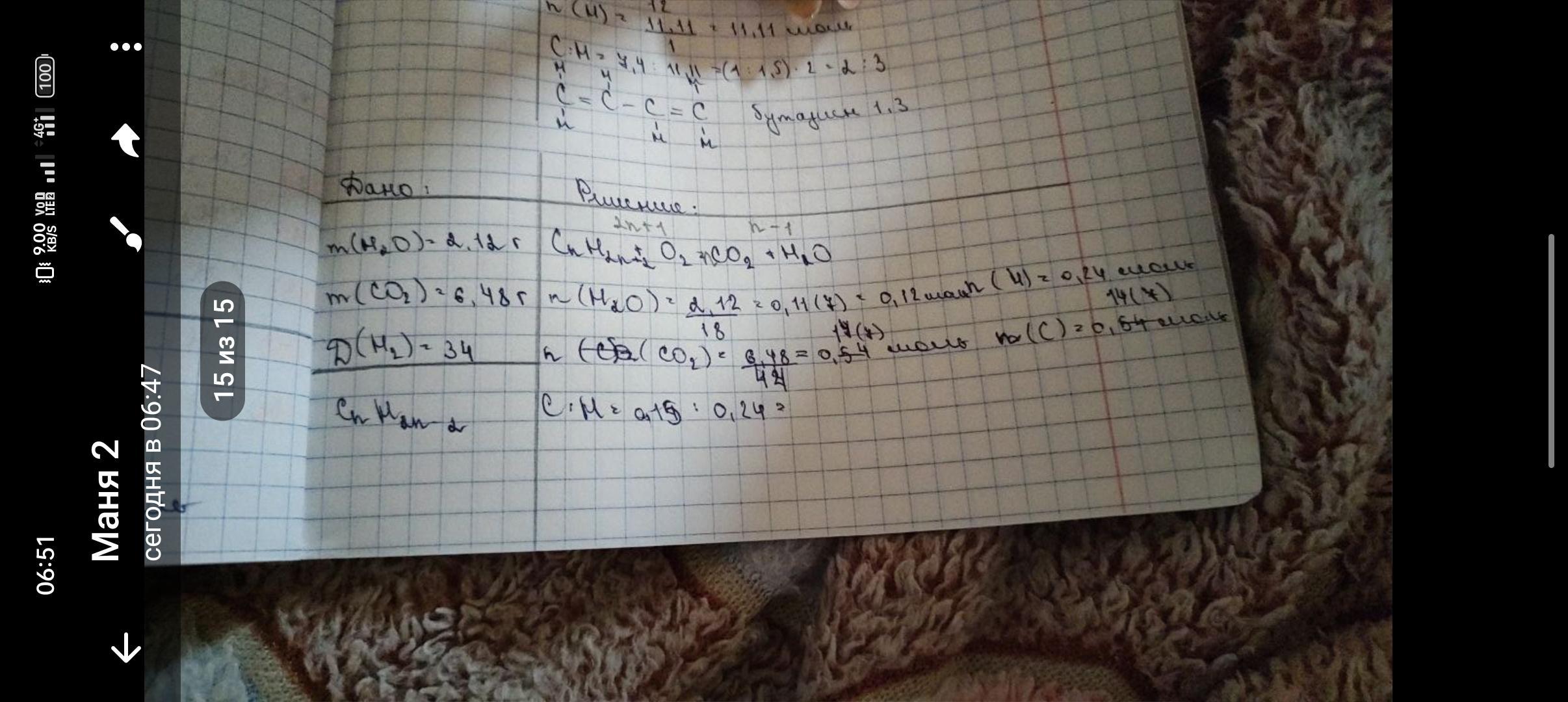 Дано: m(H2O)=2,12г m(CO2)=6,48г D(H2)=34. Найти: CnH '2n-2'. Решение: CnH '2n-2' +O2=Co2+H2O. Решить по этой формуле, дорешайте, пожалуйста. 50 баллов!!!