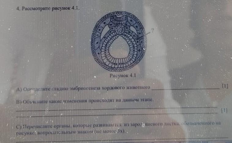 С) Перечислите органы, которые развиваются из зароль невого листка, обозначенного на рисунке, вопросительным знаком (не менее 3х)..