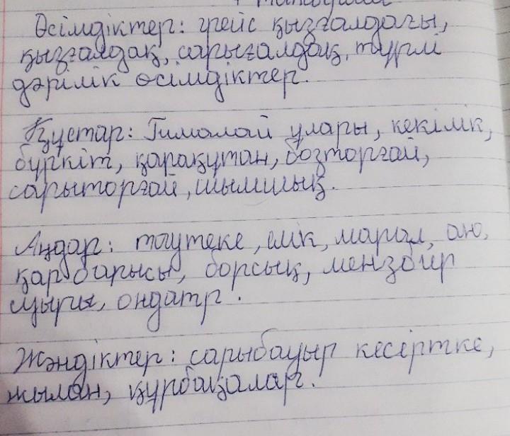 ЖАЗЫЛЫМ 7-тапсырма. Мәтіннен аң, құс, жәндік пен өсімдік атауларын теріп жаз. Аң Құс Жәндік Өсімдік