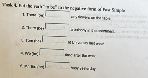 Task 4. Put the verb "to be" to the negative form of Past Simple 1. There (be) any flowers on the table. 2. There (be) 3. Tom (be) 4. We (be) 5. Mr. Bin (be) a balcony in the apartment. at University last week. tired after the walk. busy yesterday. motrizia helbreng va