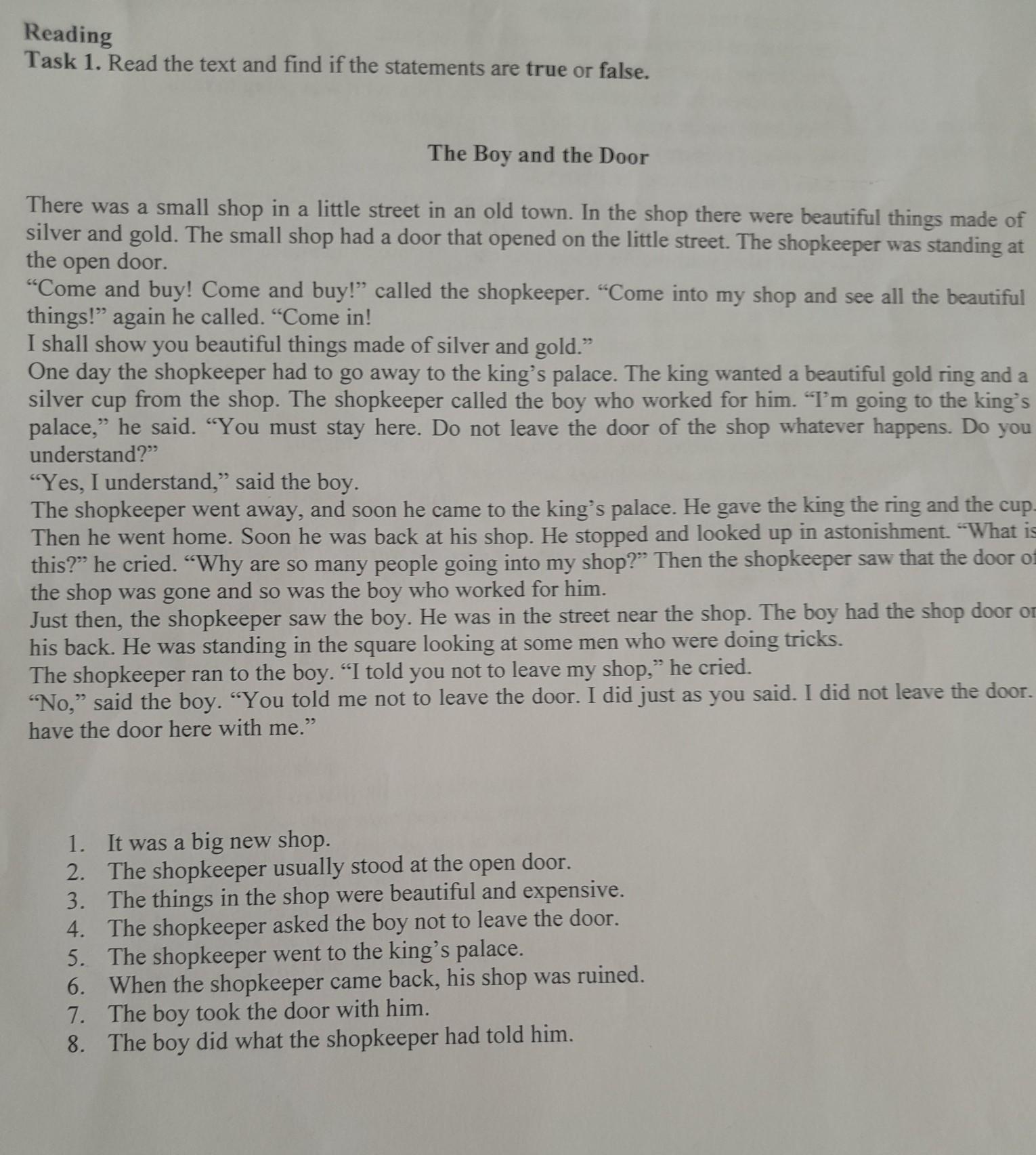 Reading Task 1. Read the text and find if the statements are true or false. The Boy and the Door There was a small shop in a little street in an old town. In the shop there were beautiful things made o silver and gold. The small shop had a door that opened on the little street. The shopkeeper was standing a the open door. "Come and buy! Come and buy!" called the shopkeeper. "Come into my shop and see all the beautifu things!" again he called. "Come in! I shall show you beautiful things made of silver and gold." One day the shopkeeper had to go away to the king's palace. The king wanted a beautiful gold ring and silver cup from the shop. The shopkeeper called the boy who worked for him. "I'm going to the king palace," he said. "You must stay here. Do not leave the door of the shop whatever happens. Do yo understand?" "Yes, I understand," said the boy. The shopkeeper went away, and soon he came to the king's palace. He gave the king the ring and the cu Then he went home. Soon he was back at his shop. He stopped and looked up in astonishment. "What this?" he cried. "Why are so many people going into my shop?" Then the shopkeeper saw that the door the shop was gone and so was the boy who worked for him. Just then, the shopkeeper saw the boy. He was in the street near the shop. The boy had the shop door his back. He was standing in the square looking at some men who were doing tricks. The shopkeeper ran to the boy. "I told you not to leave my shop," he cried. "No," said the boy. "You told me not to leave the door. I did just as you said. I did not leave the doc have the door here with me." 1. It was a big new shop. 2. The shopkeeper usually stood at the open door. 3. The things in the shop were beautiful and expensive. 4. The shopkeeper asked the boy not to leave the door. 5. The shopkeeper went to the king's palace. 6. When the shopkeeper came back, his shop was ruined. 7. The boy took the door with him. 8. The boy did what the shopkeeper had told him.
