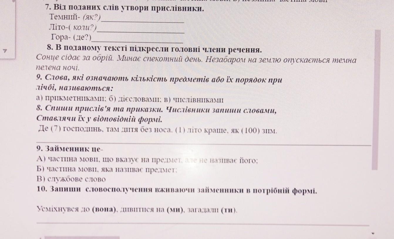 8. Сонце ( хто?, підмет, треба підкреслити) сідає (що робить?, присудок, треба підкреслити) за обрій (куди?, обставина, не треба підкреслювати). Минає (що робить?, присудок, треба підкреслити) спекотний (який?, означення, не треба підкреслювати) день (це підмет, треба підкреслити). Незабаром (коли?, обставина, не треба підкреслювати) на землю (куди?, обставина, не треба підкреслювати) опускається (що робить?, присудок, треба підкреслити) темна (яка?, означення, не треба підкреслювати) пелена (що, підмет, треба підкреслити) ночі (означення, не треба підкреслювати).