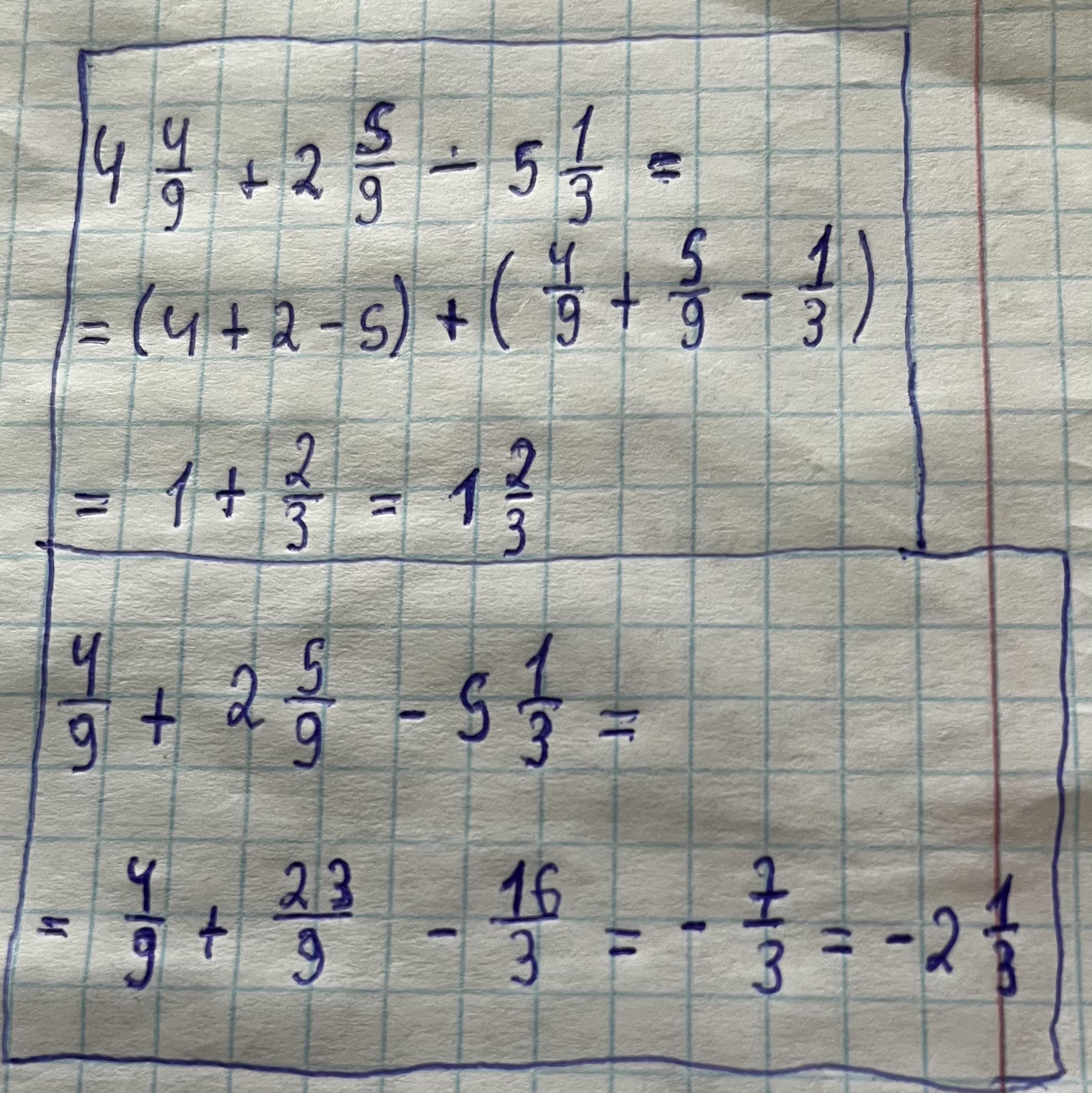 Пошаговое объяснение: Если в примере 4 целых 4/9 то это первый вариант, если просто 4/9 то это второй вариант решение. В первом варианте мы просто складываем целые числа а во вторых скобках дроби, во втором варианте мы дроби переделываем в мешаные дроби