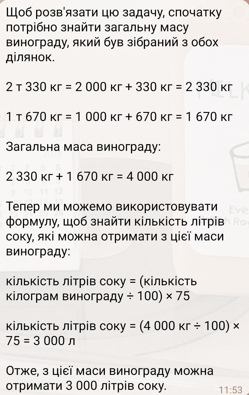 5.4. Розв'яжи задачу. З першої ділянки зібрали 2 т 330 кг винограду, а з другої - 1 т 670 кг. Скільк літрів соку отримають із цього винограду, якщо з кожних 100 кг винограду виготовляють 75 л соку ?