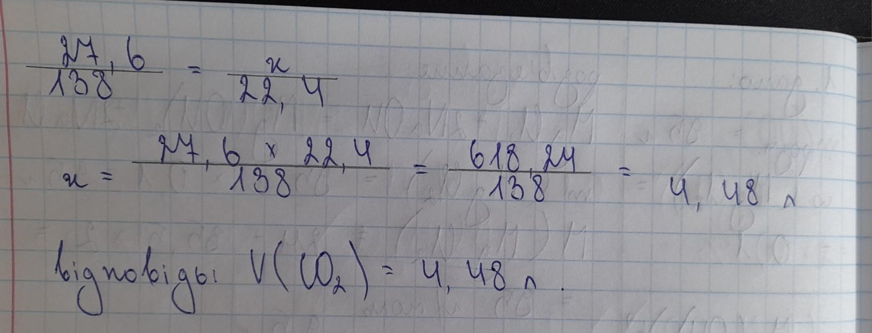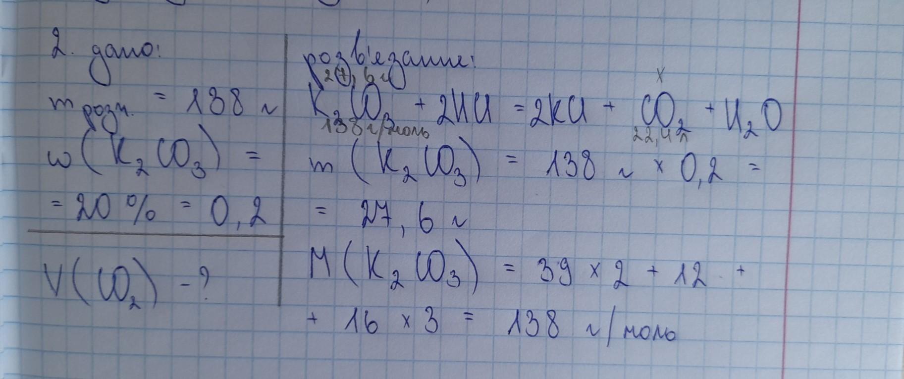 До розчину масою 138 г із масовою часткою калій карбонату 20 % долили хлоридну кислоту до повної взаємодії. Обчисліть об’єм (н. у.) утвореного внаслідок реакції газу.