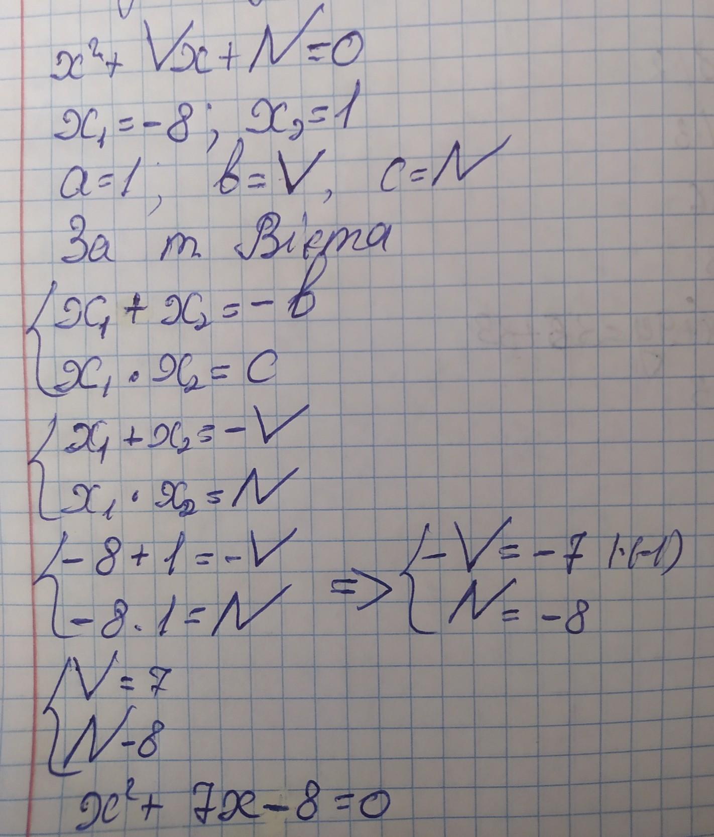 Квадратне рівняння х²+ Vx + N = 0 має такі корені: - 8 та 1 Чому дорівнюють коефіцієнти V та N? ДАМ 50 БАЛЛОВ ПРОШУ