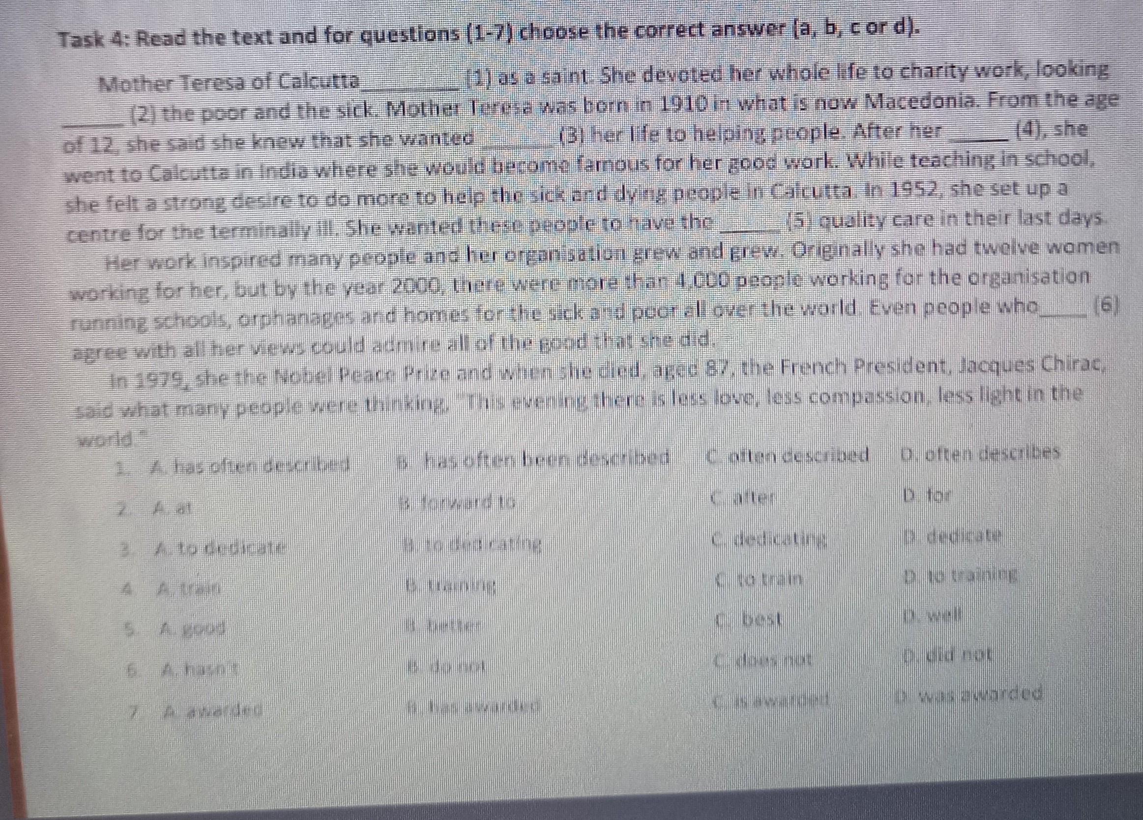 Read the text and for questions (1-7) choose the correct answer (a,b,c or d)