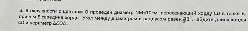 3. В окружности с центром О проведен диаметр им=10см, пересекающий хорду CD в точке причем Е середина хорды. Угол между диаметром и радиусом равен 20º.Найдите длину хорд CD и периметр ∆COD. 70 баллов
