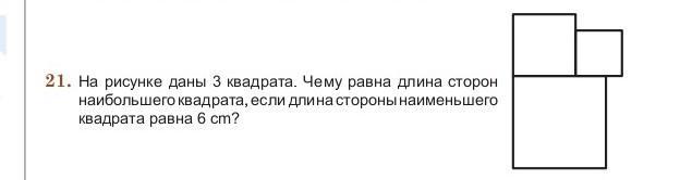На рисунке даны 3 квадрата. Чему равна длина сторон наибольшего квадрата, если длина стороны наименьшего квадрата равна 6 cm?