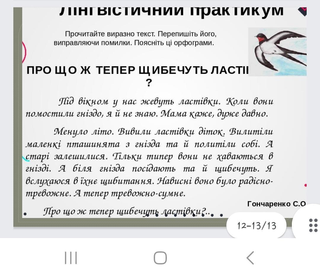 Під вікном у нас живуть ластівки. Коли вони помостили гніздо, я й не знаю. Мама каже, дуже давно.Минуло літо. Вивели ластівки діток. Вилетіли маленькі пташенята з гнізда та й полетіли собі. А старі залишилися. Тільки тепер вони не ховаються в гнізді. А біля гнізда посідають та й щебечуть. Я вслухаюся в їхнє щебетання. Навесні воно було радісно-тривожне. А тепер тривожно-сумне.Про що ж тепер щебечуть ластівки?.