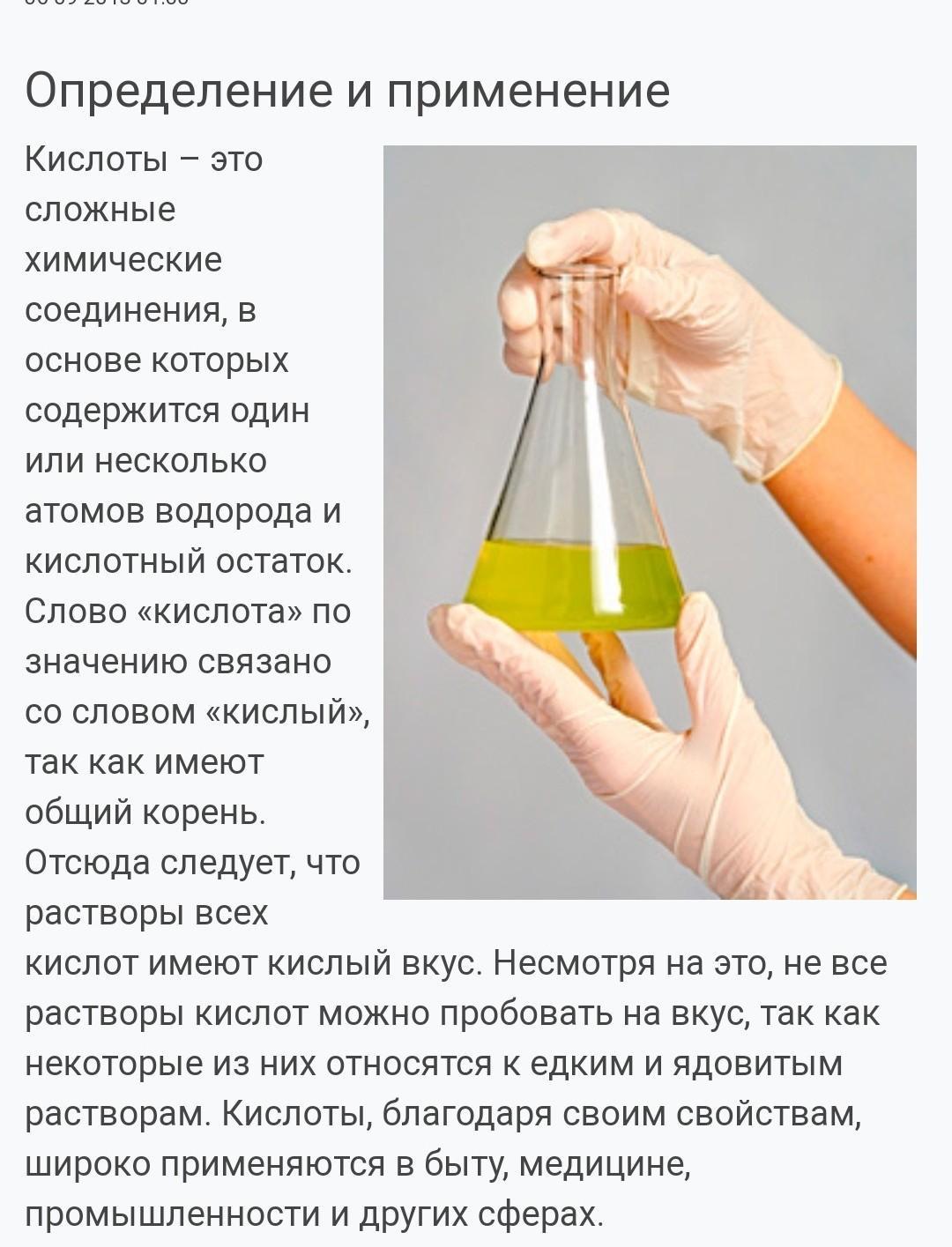 Кислоты — это сложные химические вещества, состоящие из одного или нескольких атомов водорода, способных замещаться атомами металла, и кислотных остатков. Кислоты проявляют ряд общих химических свойств: диссоциацию и разложение, взаимодействуют с металлами, основаниями, солями, основными и амфотерными оксидами