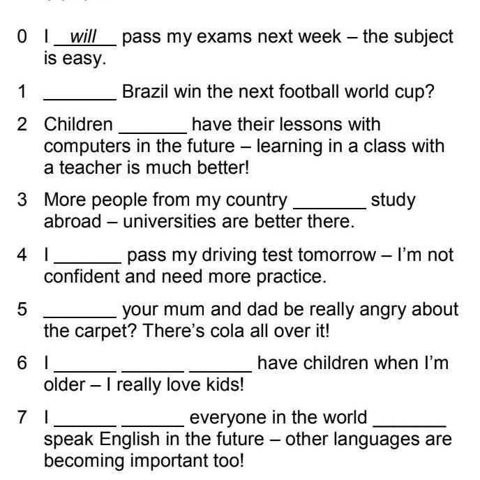 Complete these sentences using will/won't. You have to add two extra words in questions 6-7.