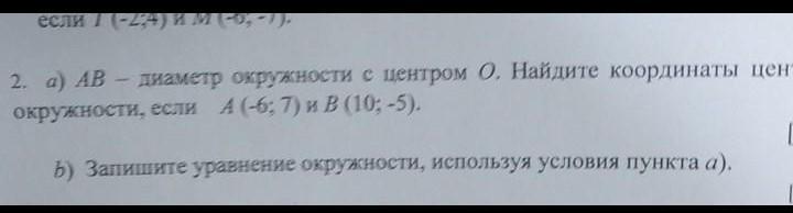 2. a) AB диаметр окружности с центром О. Найдите координ окружности, если А(-6; 7) и В (10;-5). b) Запишите уравнение окружности, используя условия пункта.помогите пожалуйста