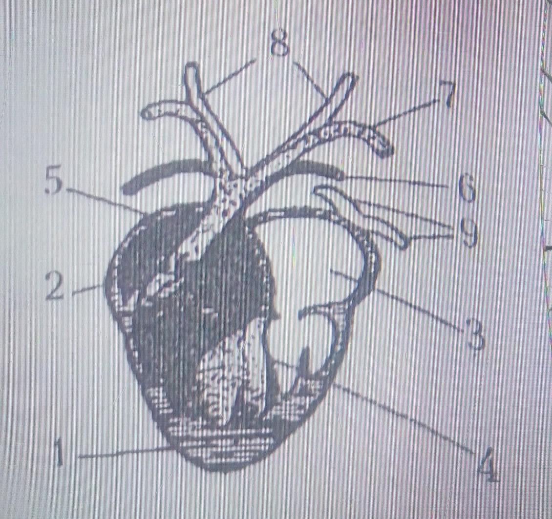 7. Бальная часть тела лягушки снабжается кровью, которая поступает по сосудам, обозначенным на схеме строения сердца цифрой: 1) 6. 2)7. 3) 8. 4)9.