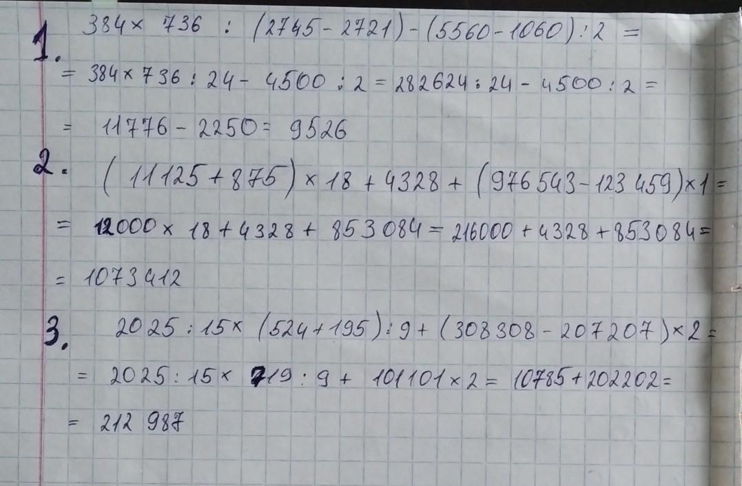 ДОМАШНЕЕ ЗАДАНИЕ 11 Найди значения выражений. 384-736: (2 745-2 721) - (5 560 - 1 060): 2 (1125+875) 18 + 4 328+ (976 543-123 459) 1 2025:15 (524+195): 9+ (308 308- 207 207) 2