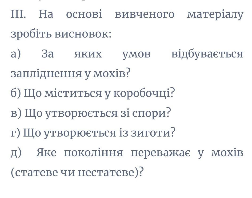 За ЯКИХ умов відбувається запліднення у мохів? б) Що міститься у коробочці? в) Що утворюється зі спори? г) Що утворюється із зиготи? д) Яке покоління переважає у мохів (статеве чи нестатеве)? a)