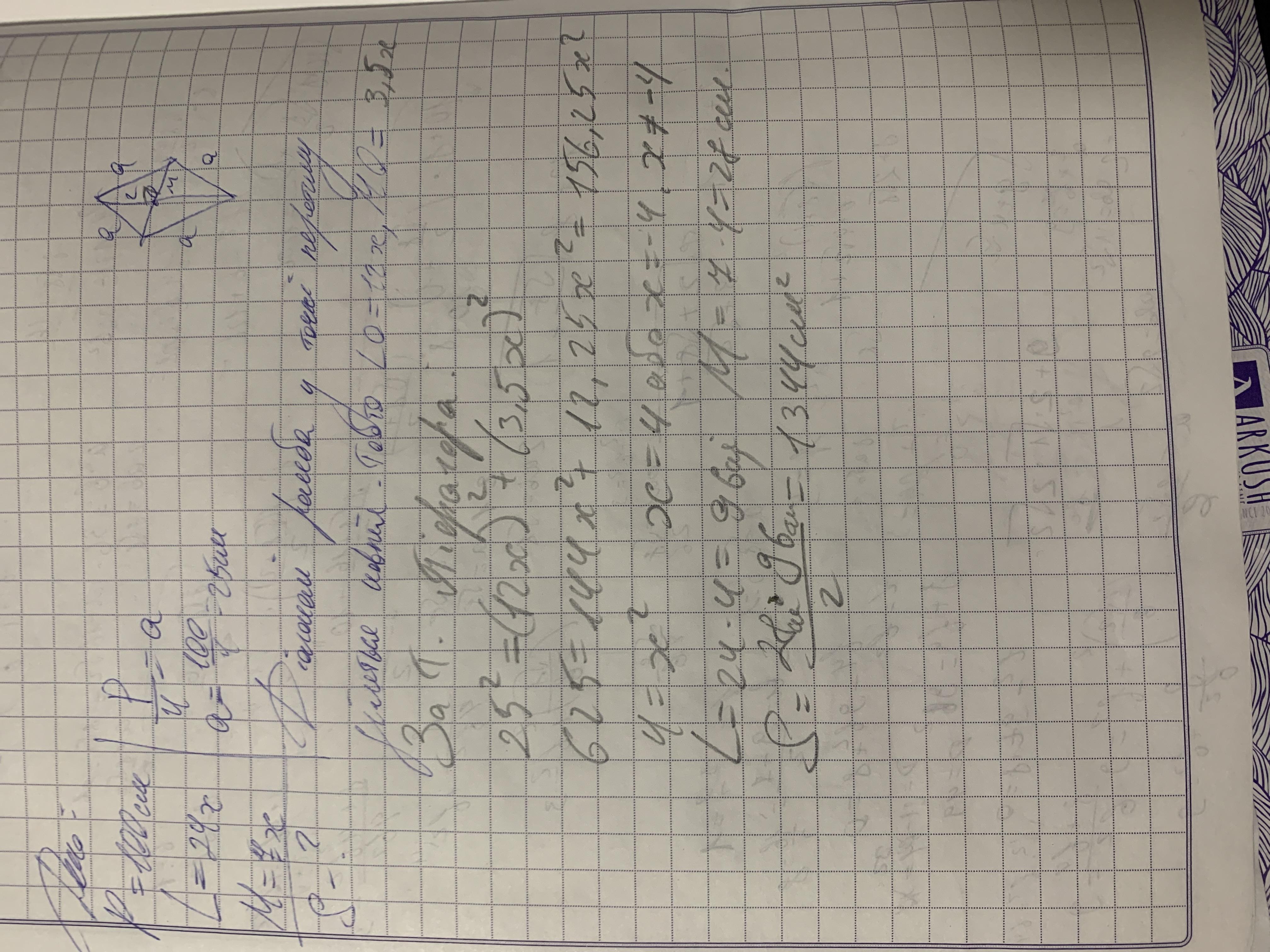 Діагоналі ромба вiдносяться як 24 : 7. Знайдіть площу ромба, якщо його периметр дорiвнюс 100 см.