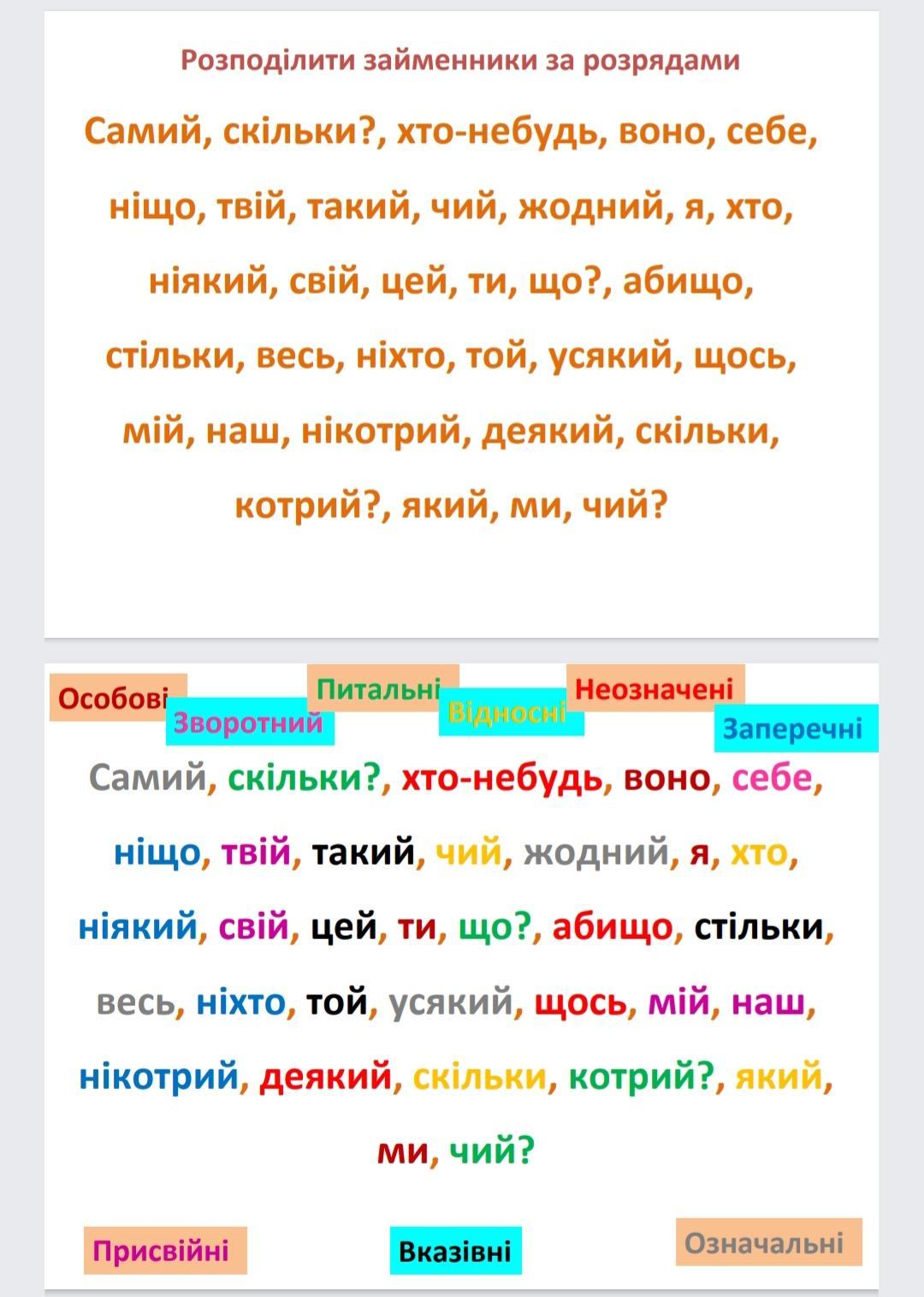 Займе́нник — це самостійна частина мови, що вказує на особу, предмет, ознаку, кількість, але не називає їх. Наприклад: він, ми, щось (вказують на особу, предмет); той, мій, всякий (вказують на ознаку); скільки, стільки (вказують на кількість). Займенники відповідають на питання хто? що?