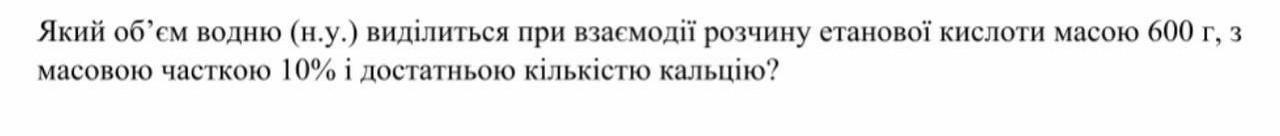 будь ласка срочно який обʼєм водню (н.у.) виділиться при взаємодії розчину етанової кислоти масою 600 г, з масовою часткою 10% і достатньою кількістю кальцію?