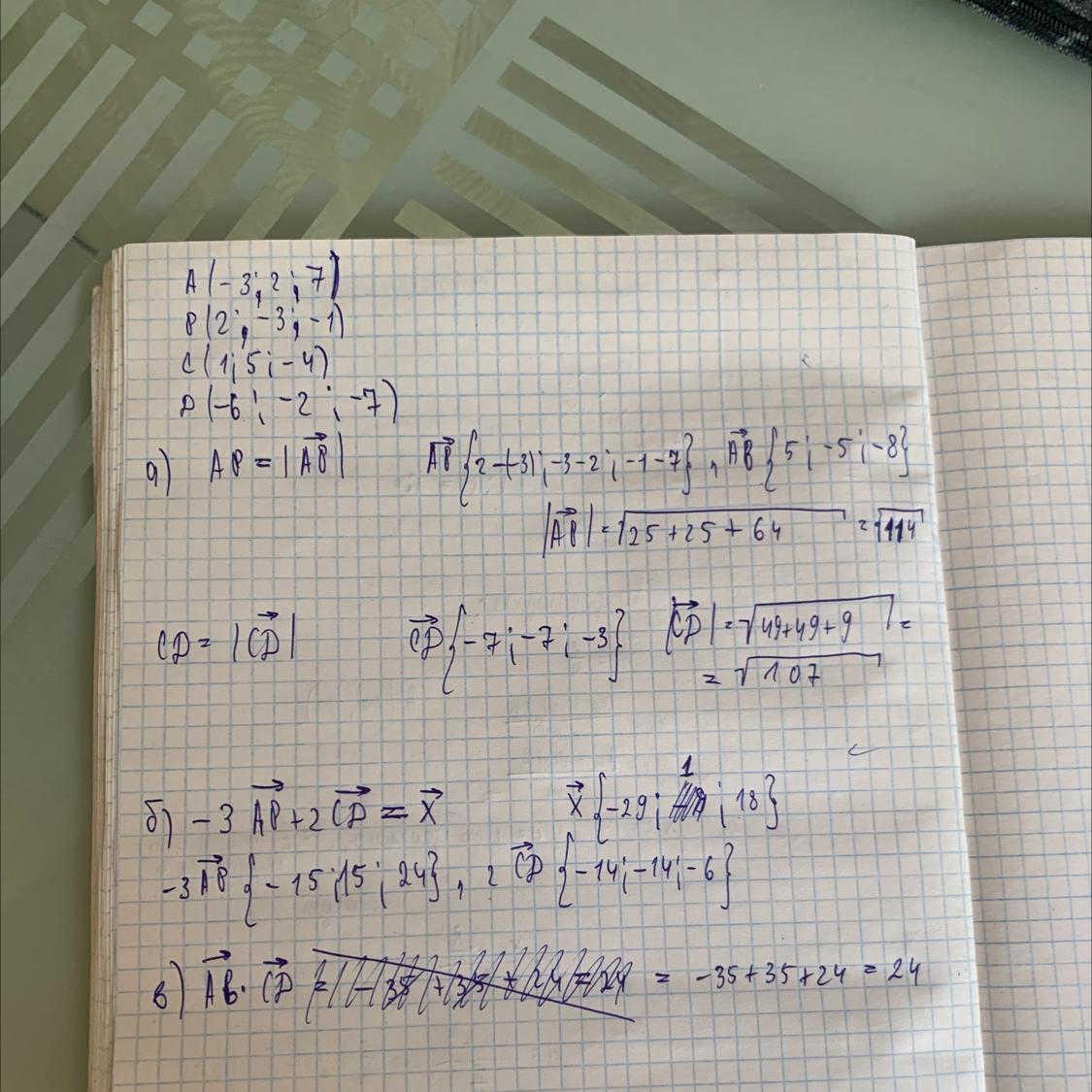 дано: А(-3; 2; 7); В(2; -3; -1) ; С( 1;5; -4) Д(-6; -2; -7) Знайти: а) АВ; СД; в)АВ *СД; б) -3 АВ +2 СД