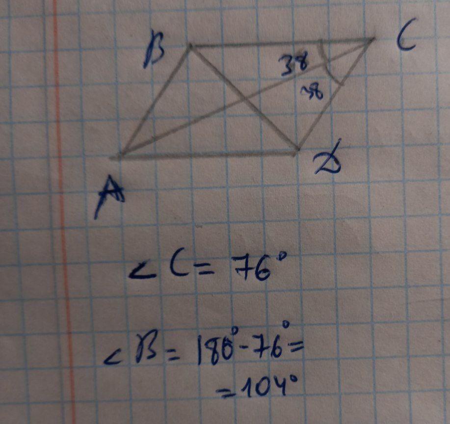 Оскільки діагональ ромба ділить кут навпіл, то гострий кут ромба дорівнює 38*2 = 76°