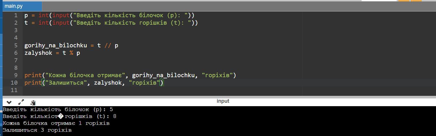 Створи програму розв'язання задачі в середовищі Python. Задача. Є п білочок та t горішків, які Потрібно розділити порівну між білочками. По скільки цілих горіхів отримає кожна білочка і скільки горіхів залишиться?Мне нужно фото в python срочно даю 70 баллов!!
