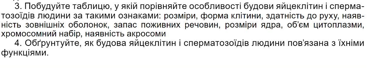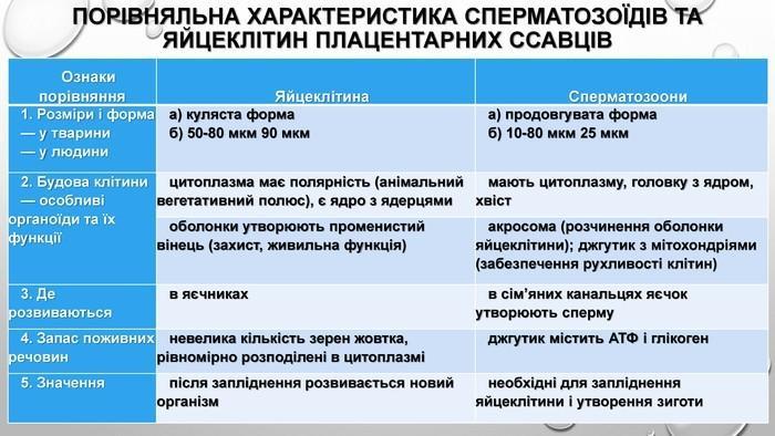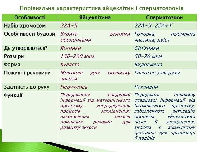 2. Функції яйцеклітини і сперматозоїда різні, тому за будовою вони дуже різняться. Яйцеклітини нерухомі, кулясті або дещо видовженої форми. Вони містять усі типові клітинні органели, але за будовою відрізняються від інших клітин, оскільки пристосовані для реалізації розвитку цілого організму. Яйцеклітини значно більші, ніж соматичні клітини. Внутрішньоклітинна структура цитоплазми специфічна для кожного виду тварин, чим забезпечуються видові (а часто й індивідуальні) особливості розвитку зародка. До них належить поживний матеріал (жовток). Яйцеклітини вкриті оболонками, які виконують захисну функцію, забезпечують необхідний тип обміну речовин. Сперматозоїди мають здатність рухатися, що певною мірою забезпечує можливість зустрічі гамет. За зовнішньою морфологією і малою кількістю цитоплазми сперматозоїди дуже відрізняться від інших клітин, але всі основні органели в них наявні. Типовий сперматозоїд має голівку, шийку і хвіст. На передньому кінці голівки розташована акросома, яка складається з видозміненого комплексу Гольджі.