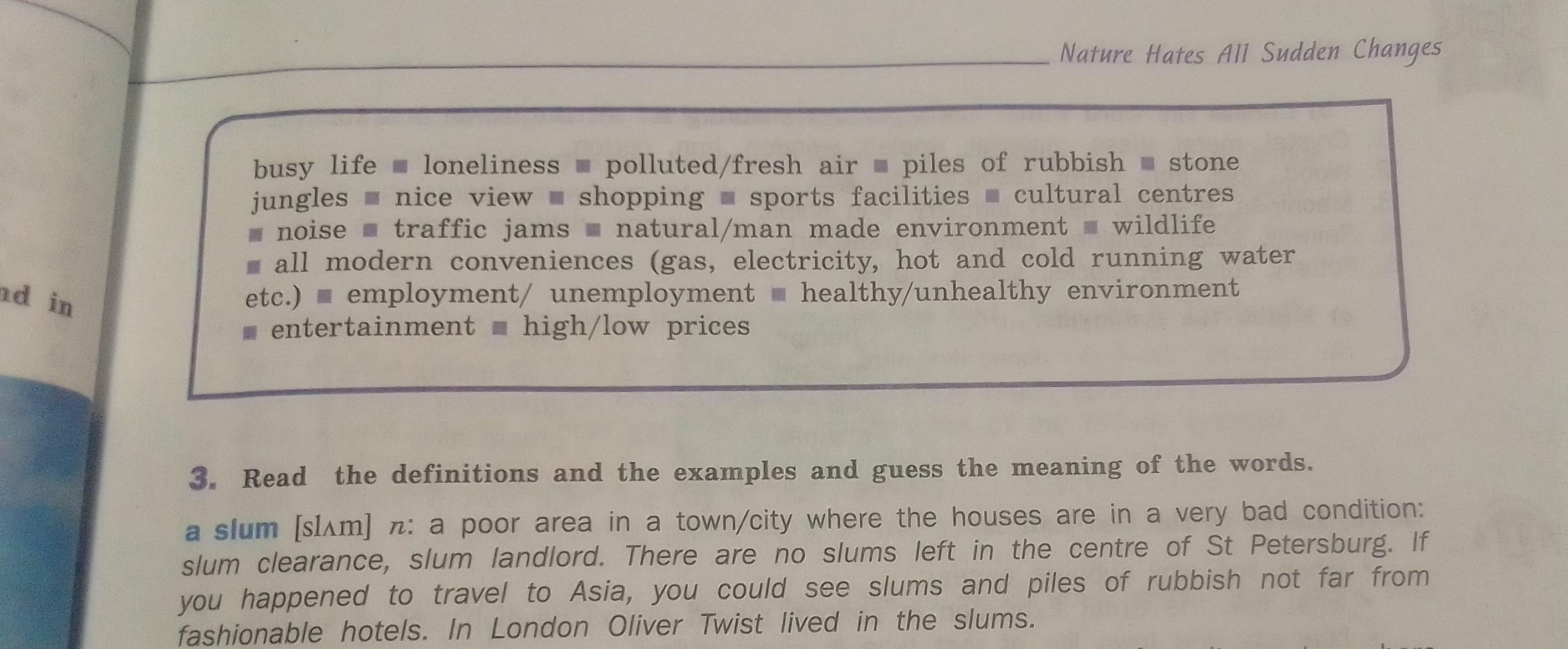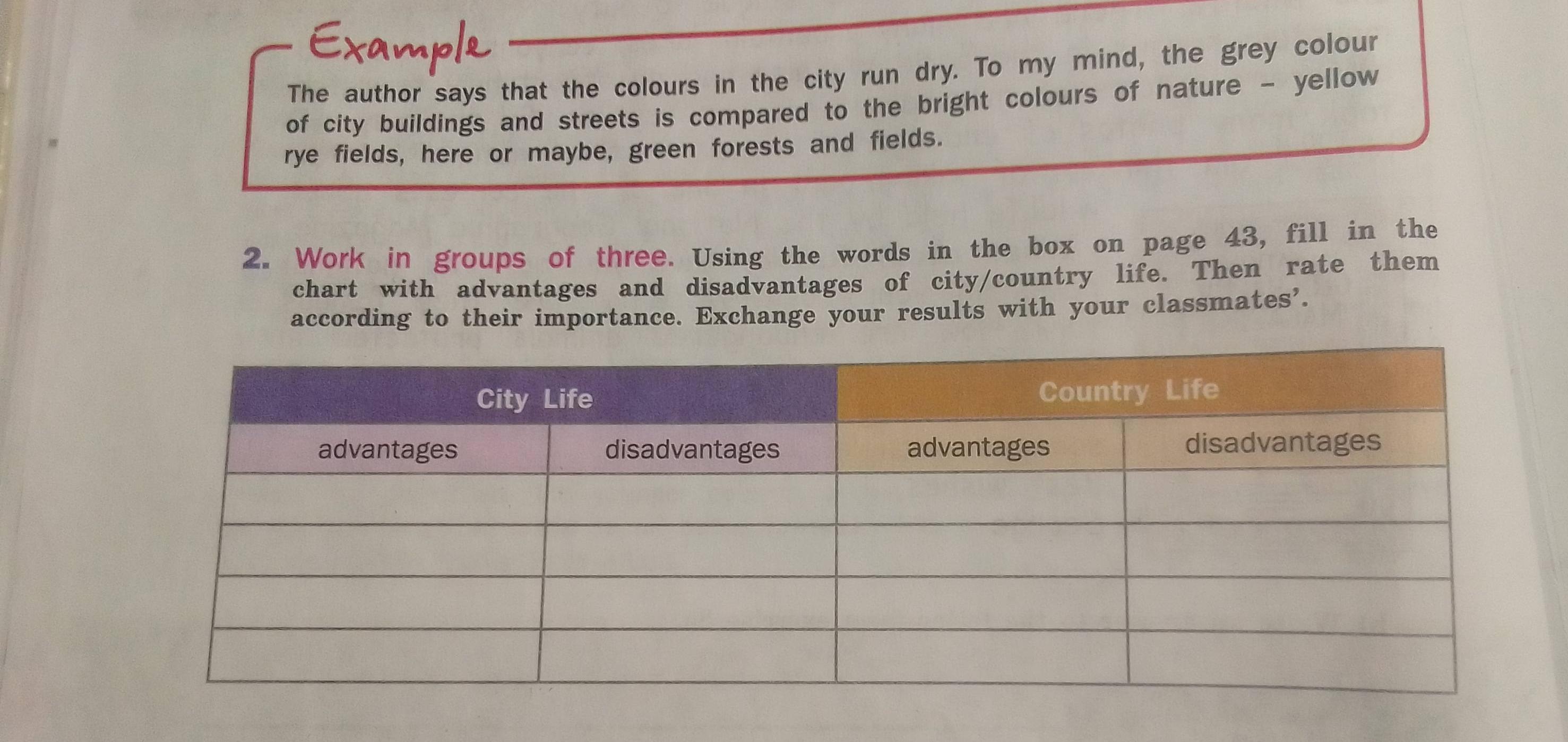 disadvantages(city life): busy life, polluted air, piles of rubbish, noise, traffic jams, man made environment, unhealthy environment, high prices, stone jungles.