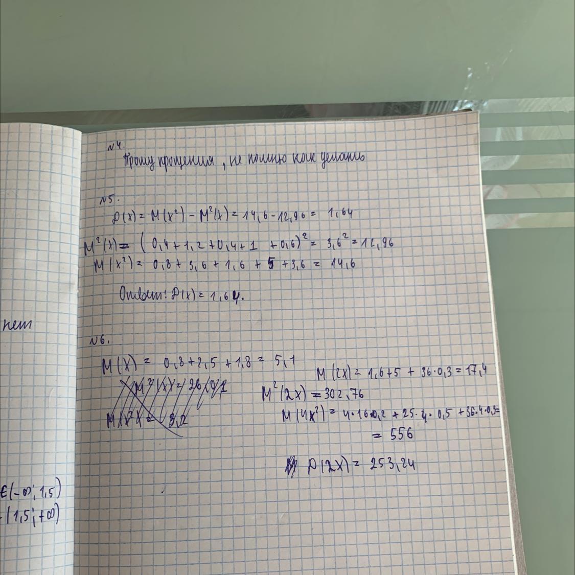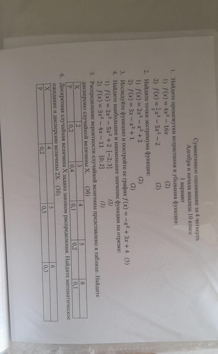 1. Найдите промежутки возрастания и убывания функции: 1) f(x) = 4x2 - 16x (2) 2) f(x)=x²³-5x²-2 Суммативное оценивание за 4 четверть Алгебра и начала анализа 10 класс 1 вариант 2. Найдите точки экстремума функции: 1) f(x) = 2x³ - x² + 2 2) f(x) = 3x-x²+1 X P (2) 3. Исследуйте функцию и постройте ее график f(x) = -x² + 3x + 4 (5) 4. Найдите наибольшее и наименьшее значение функции на отрезке: 1) f(x) = 2x³-5x² + 2 [-2;3] X P (2) (2) 4 0,2 2) f(x) = 3x² - 4x - 11 [0; 2] 5. Распределение вероятности случайной величины представлено в таблице. Найдите дисперсию случайной величины Х. (36) 2 3 0,2 0,4 6. Дискретная случайная величина х задана законом распределения. Найдите математическое ожидание и дисперсию величины 2х. (36) (3) (3) 4 0,1 5 0,5 5 0,2 6 0,3 6 0,1 (помогите гуманитарию)