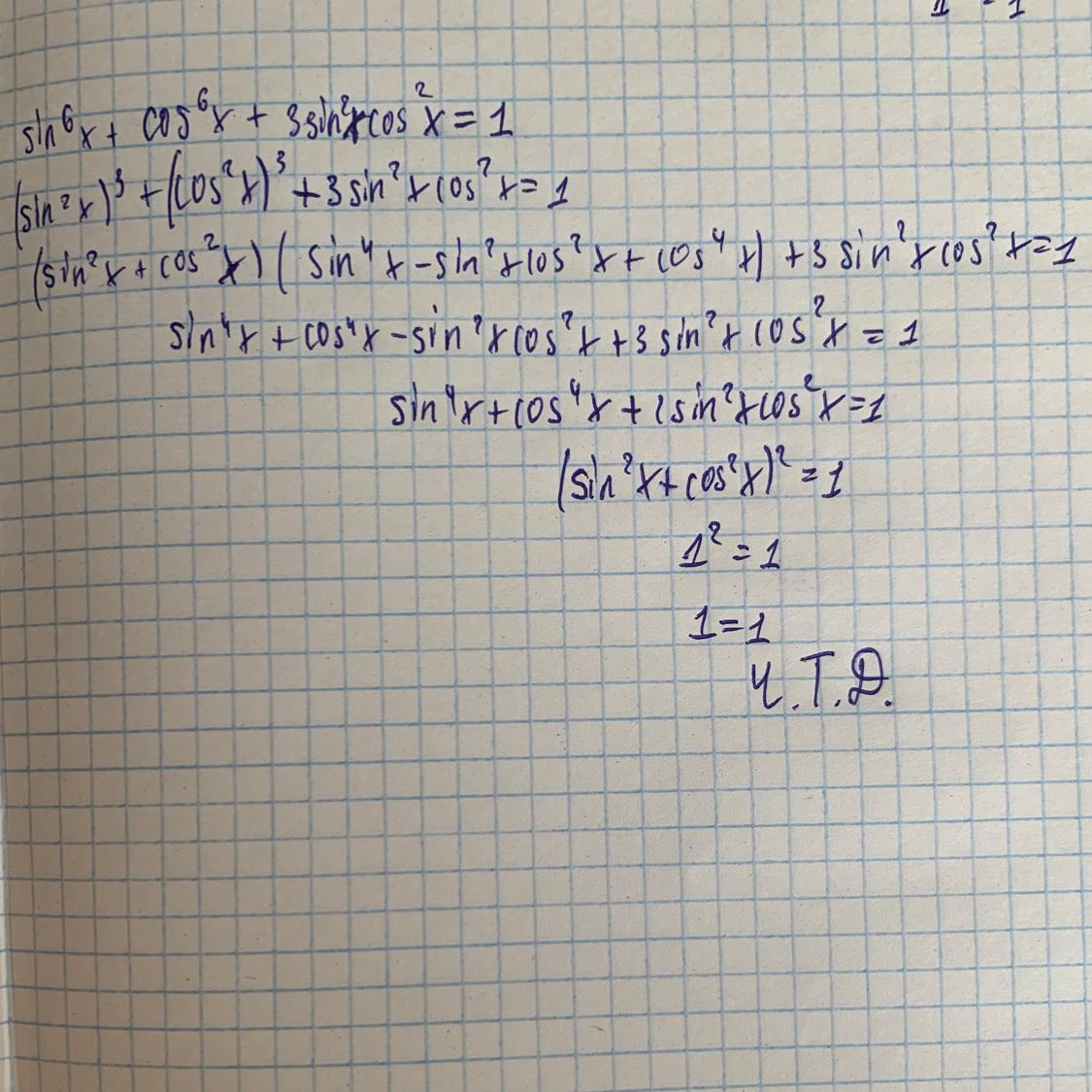 Ответ и решение на фото, использовал основное тригонометрическое тождество, формулы куба суммы и квадрата суммы.