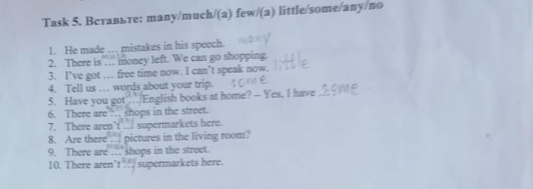 Task 5. BeraвьTе: many/much/(a) few/(a) little/some/any/no 1. He made... mistakes in his speech 2. There is ... money left. We can go any shoppingle 3. I've got. free time now. I now. www 4. Tell us words about your trip. 5. 6. 7. There aren't 8. Are there 9. There are 10. There aren't ... some English books at home? - Yes, I have some shops in the street. Have you got There are supermarkets here. pictures in the living room? shops in the street. supermarkets here.