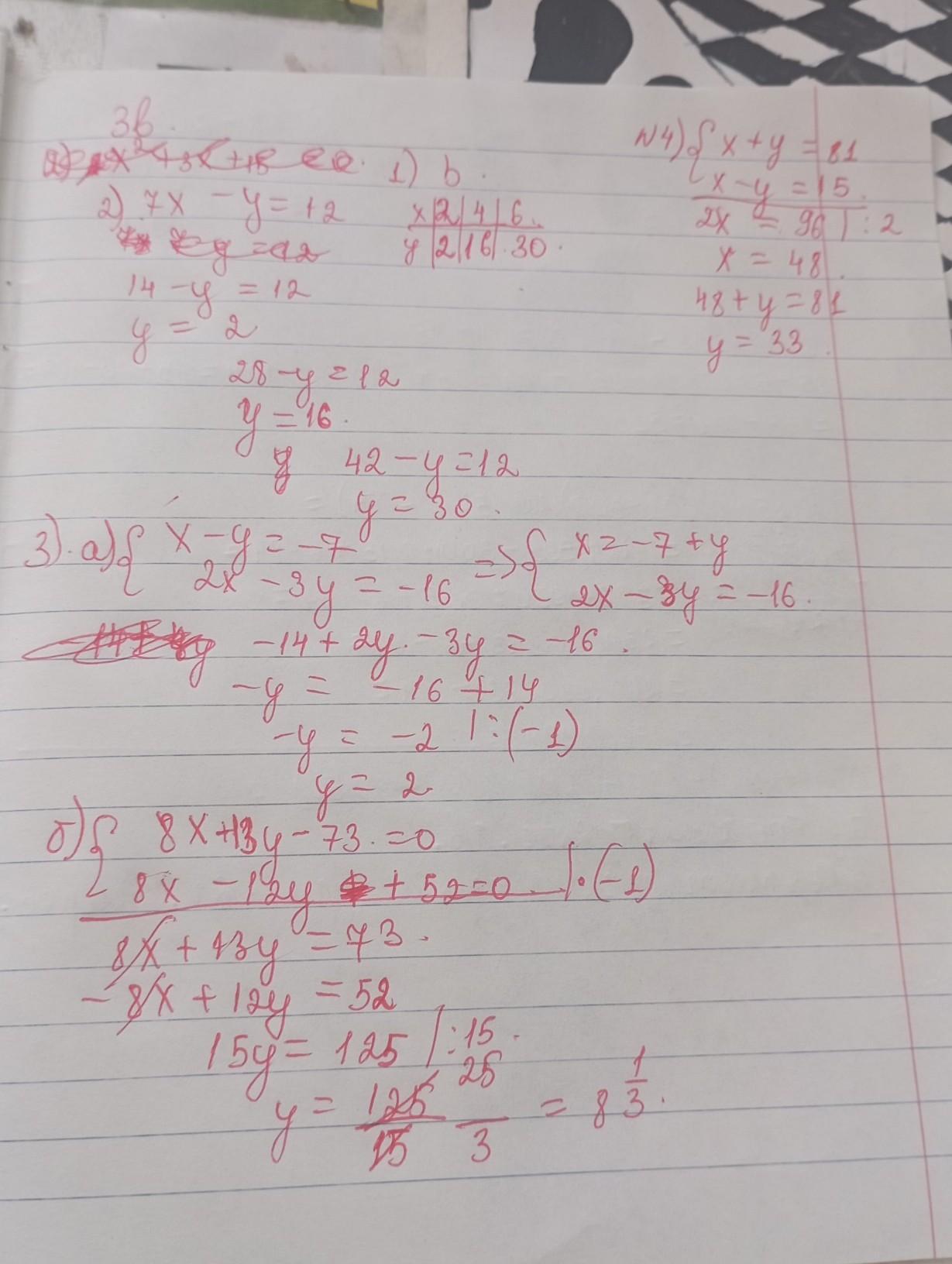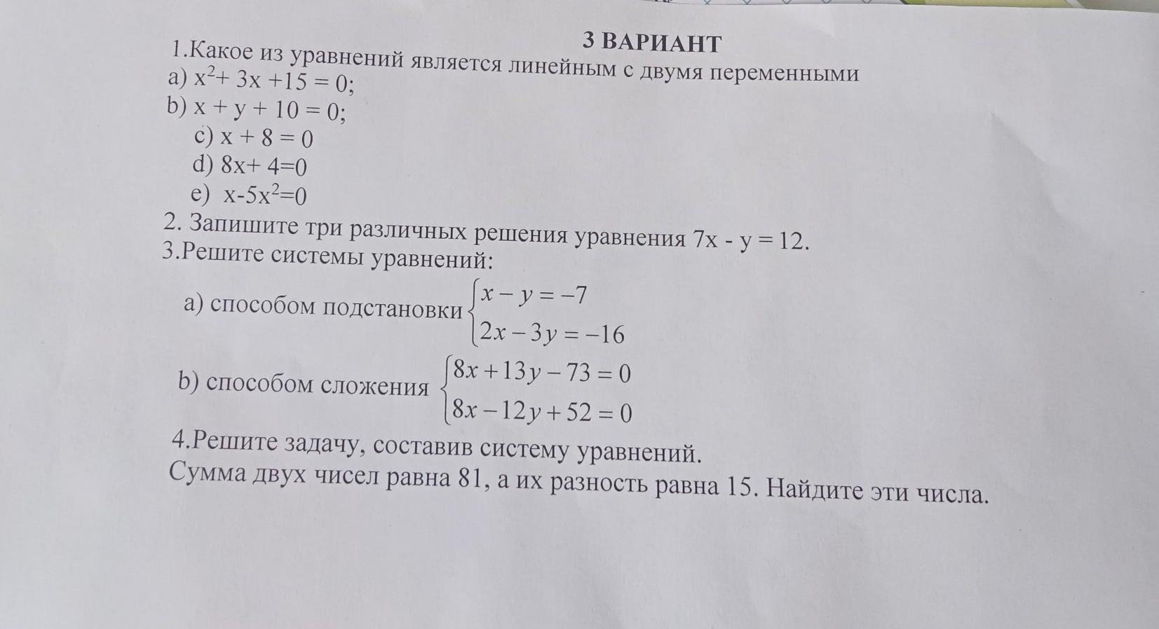 З ВАРИАНТ 1.Какое из уравнений является линейным с двумя переменными a) x2+ 3x +15 = 0; b) x+y+10=0; c) x + 8 = 0 d) 8x+ 4=0 e) x-5x2=0 2. Запишите три различных решения уравнения 7x - у = 12. 3.Решите системы уравнений: а) способом подстановки | x - y = -7 2x-3y=-16 (8x+13y-73=0 b) способом сложения 8x-12y+52 = 0 4.Решите задачу, составив систему уравнений. Сумма двух чисел равна 81, а их разность равна 15. Найдите эти числа. пожалуйста срочно помогите дам много баллов